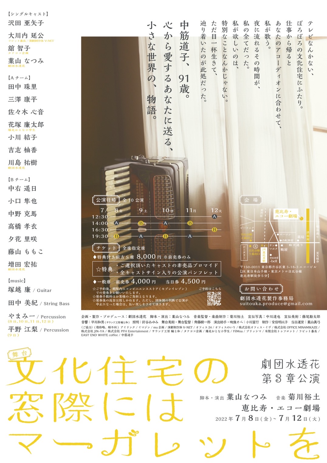 企画・製作・プロデュース 劇団水透花 / 脚本・演出 葉山なつみ / 音楽監督・楽曲制作 菊川裕土 / 宣伝写真 中川達也 / 宣伝美術 藤尾勘太郎 / 音響 早川和男(サウンド工房 輪と和) / 照明 針谷あゆみ / 舞台美術・舞台監督 齊藤樹一郎 / 演出助手・映像オペ 小川富行 / 制作 安倍明以子 /当日運営 葉山眞弓